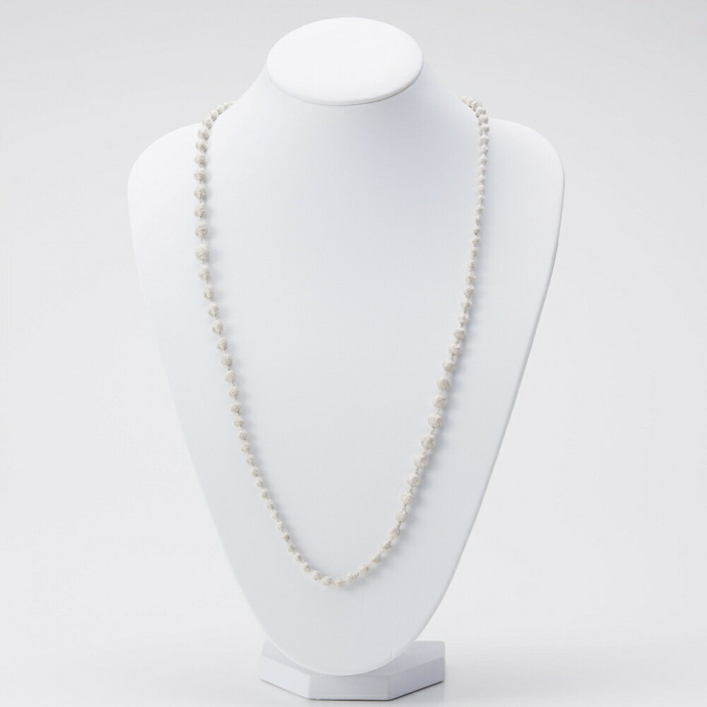 「素材のブレンド具合」「理想の番手」「風合いを左右する撚糸」など、原料から糸にする紡績の工程からこだわってオリジナルの糸をつくることで、上品な光沢がありながらナチュラルな雰囲気、そして軽くて着け心地もとても良いネックレスが誕生したのです。