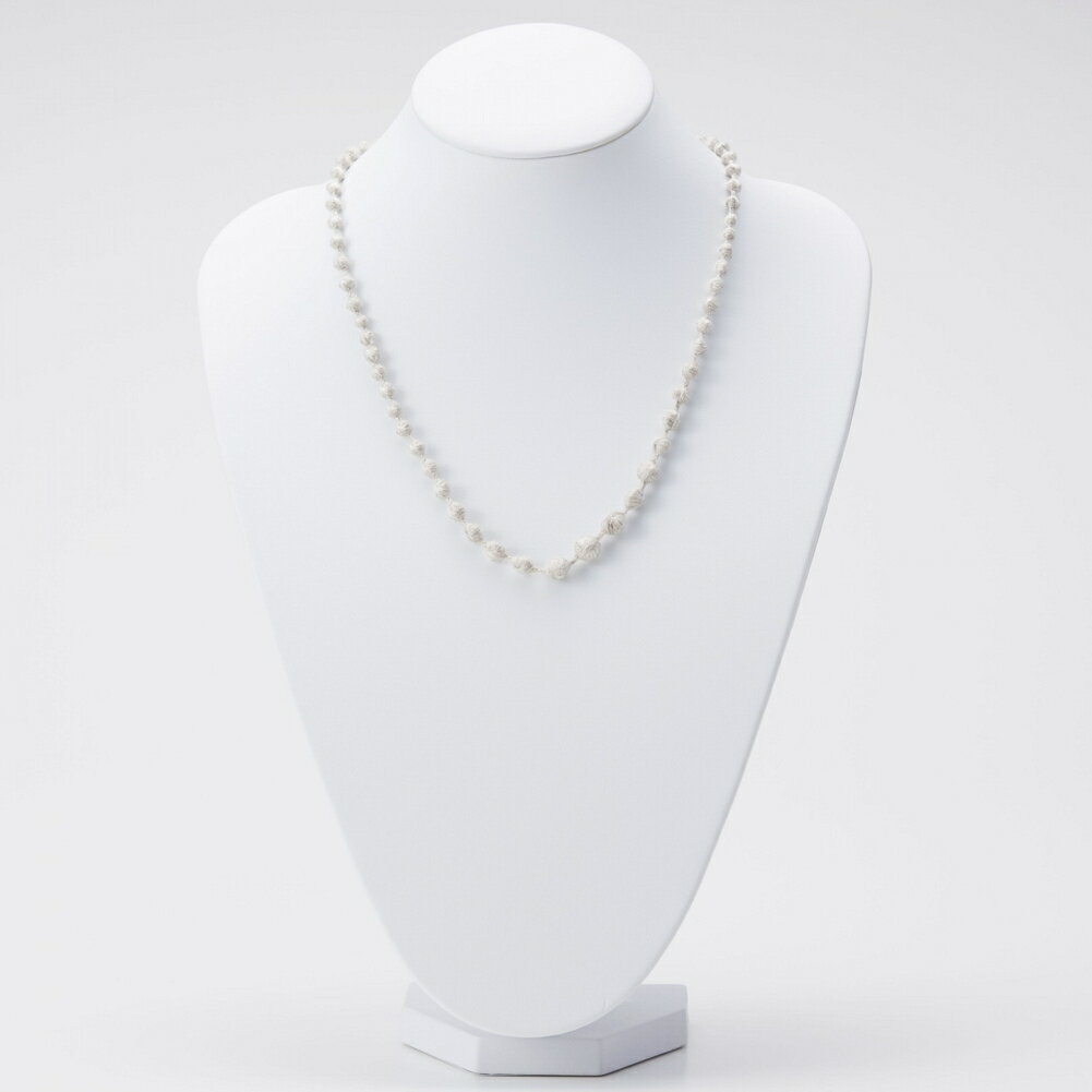 「素材のブレンド具合」「理想の番手」「風合いを左右する撚糸」など、原料から糸にする紡績の工程からこだわってオリジナルの糸をつくることで、上品な光沢がありながらナチュラルな雰囲気、そして軽くて着け心地もとても良いネックレスが誕生したのです。